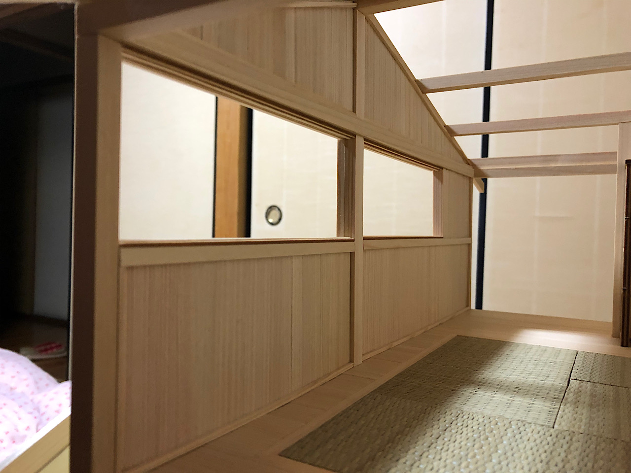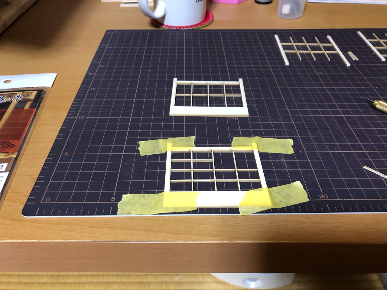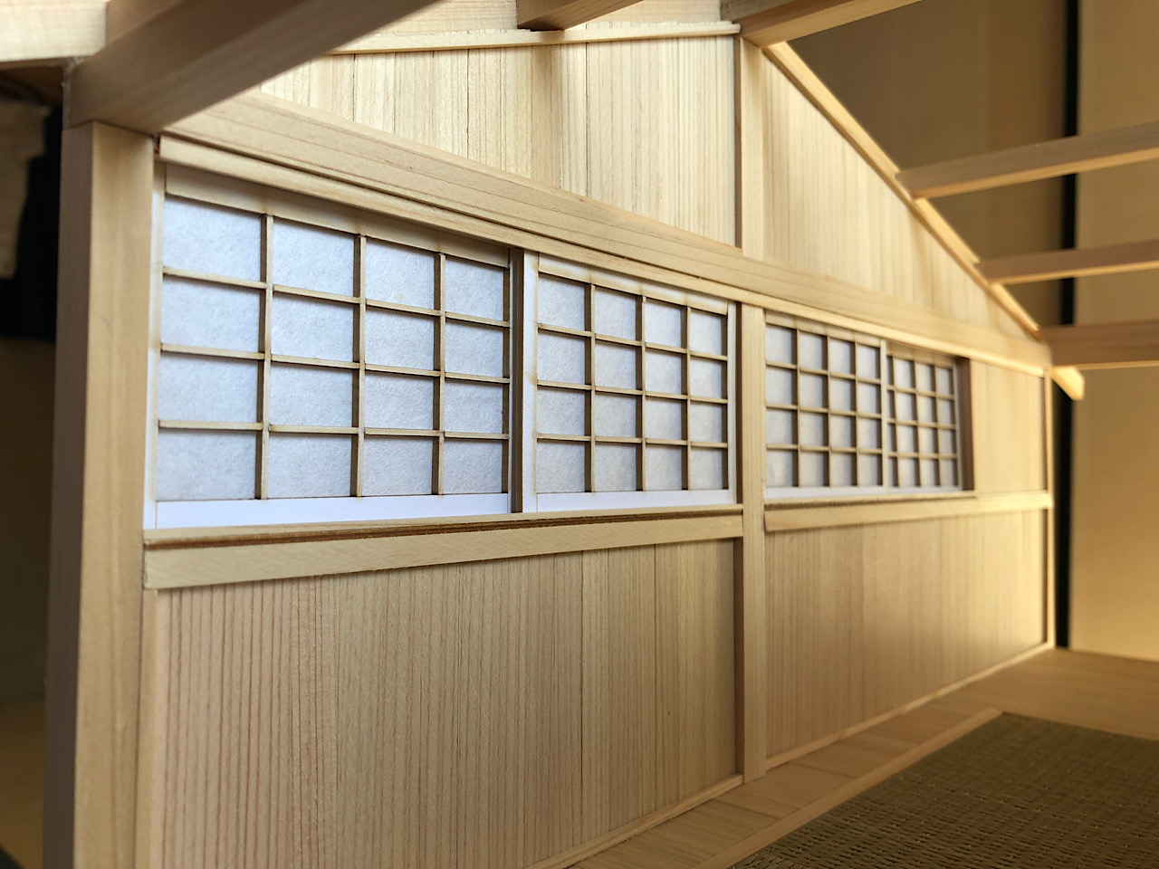 2mm角のヒノキ棒を半分にして、薄く削って更に半分にしたものを2つの溝の間にボンドで固定してみました。そして、溝の外側にも2mm角のヒノキ棒で固定し、障子を戻して内側にもヒノキ棒を固定すれば完成!