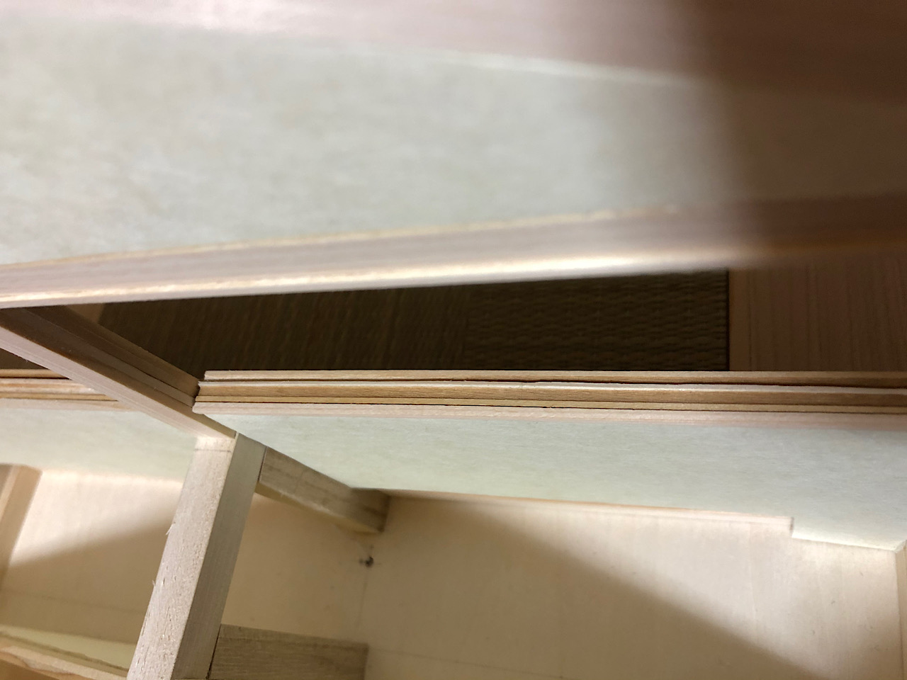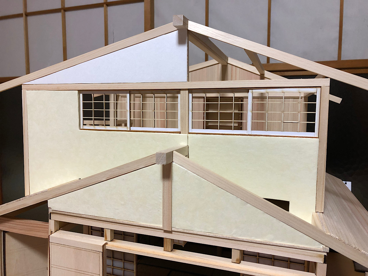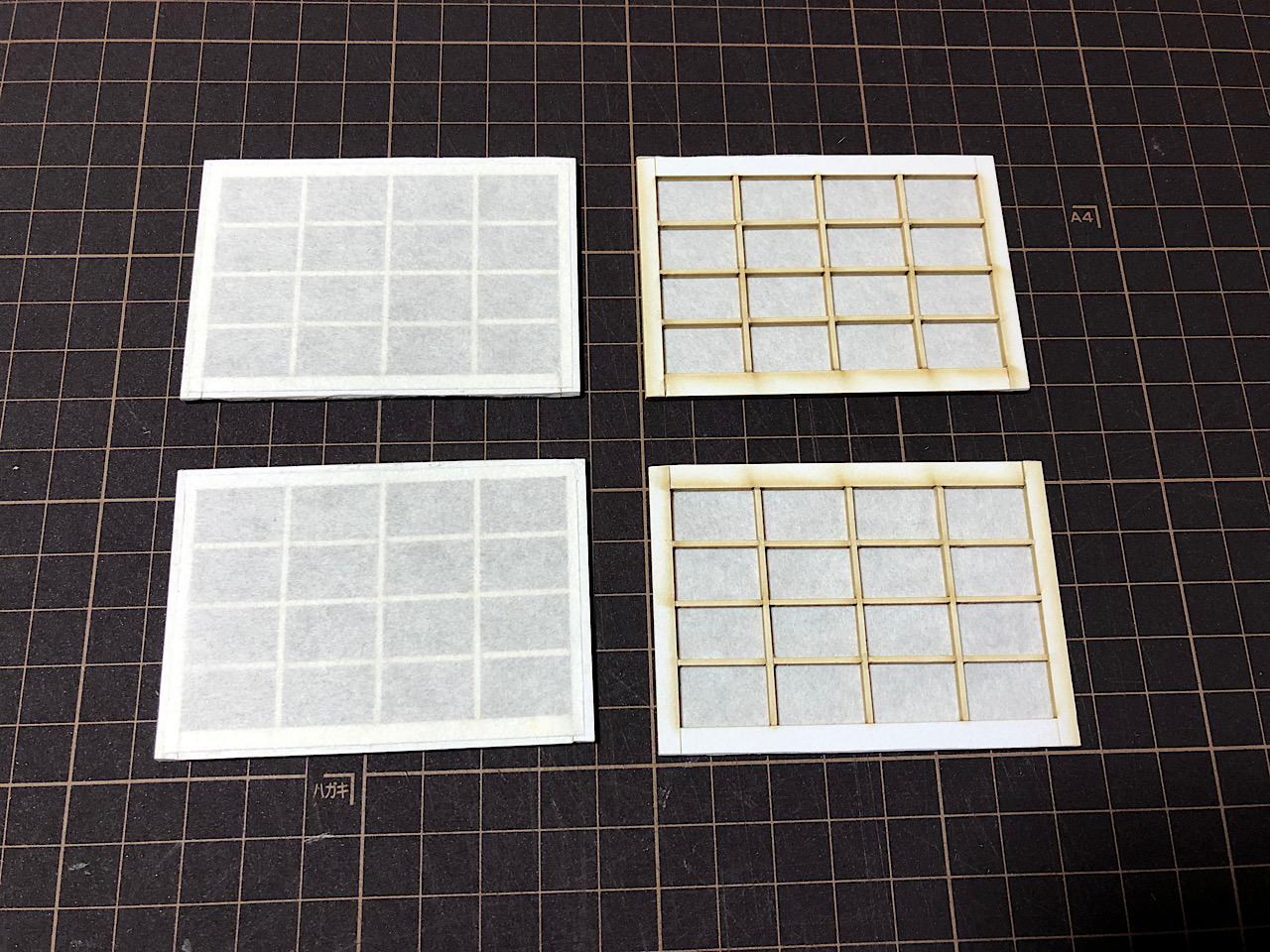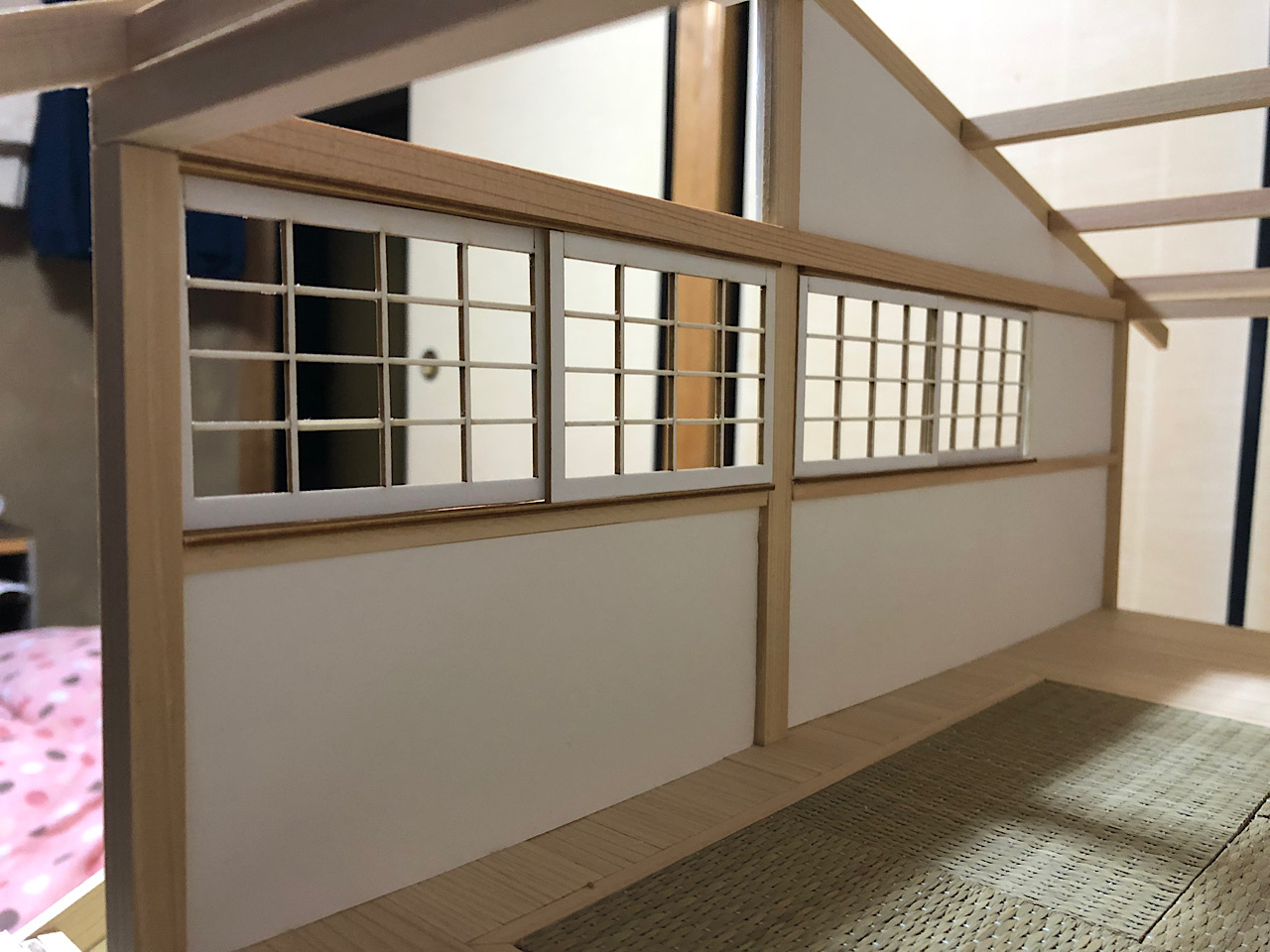 2mm角のヒノキ棒を半分にして、薄く削って更に半分にしたものを2つの溝の間にボンドで固定してみました。そして、溝の外側にも2mm角のヒノキ棒で固定し、障子を戻して内側にもヒノキ棒を固定すれば完成!
